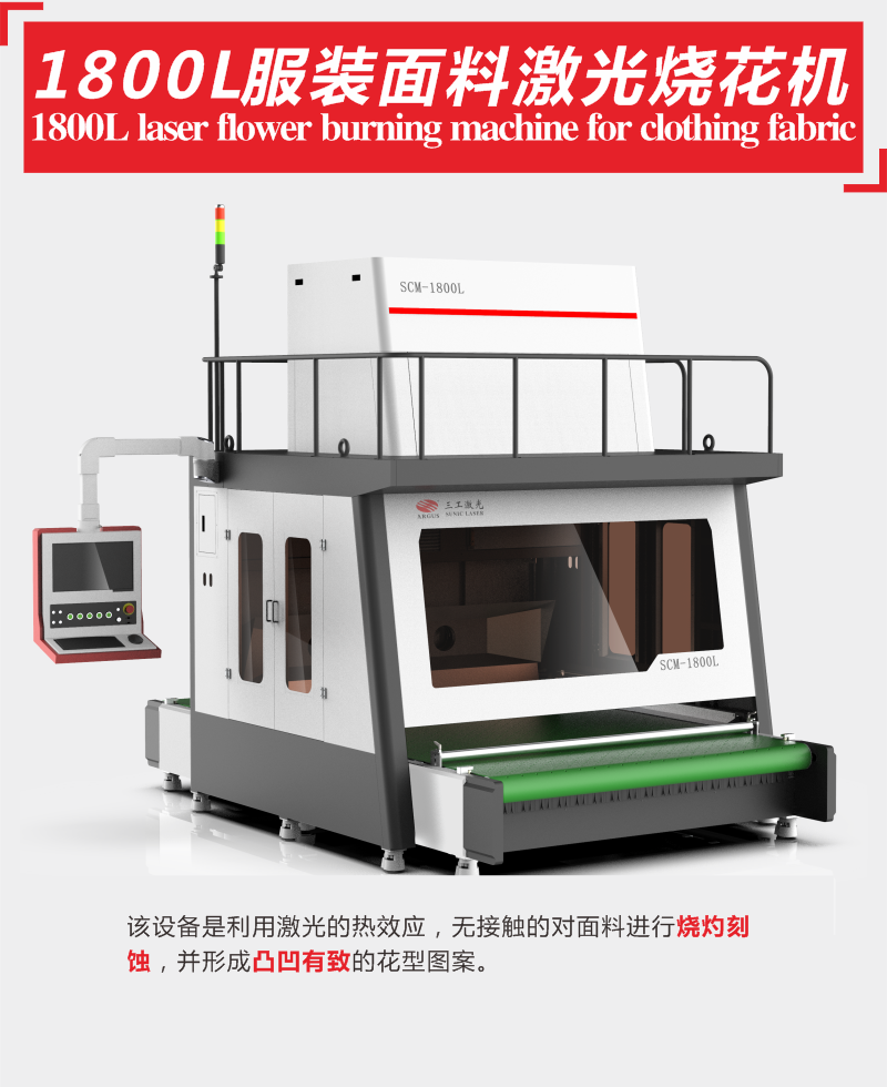 該設(shè)備是利用激光的熱效應(yīng),無接觸的對面料進(jìn)行燒灼刻蝕,并形成凸凹有致的花型圖案。